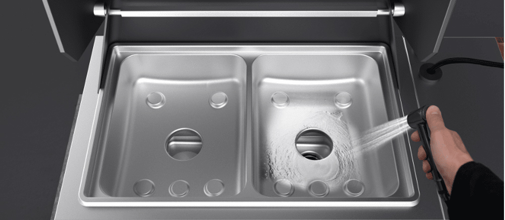 Handbrausesystem mit Wascheinheit, zum leichten Reinigen der Grillflächen und Auffangschalen. Ideal kombinierbar mit dem Warmwassererhitzer, für noch leichteres Säubern des Grills.