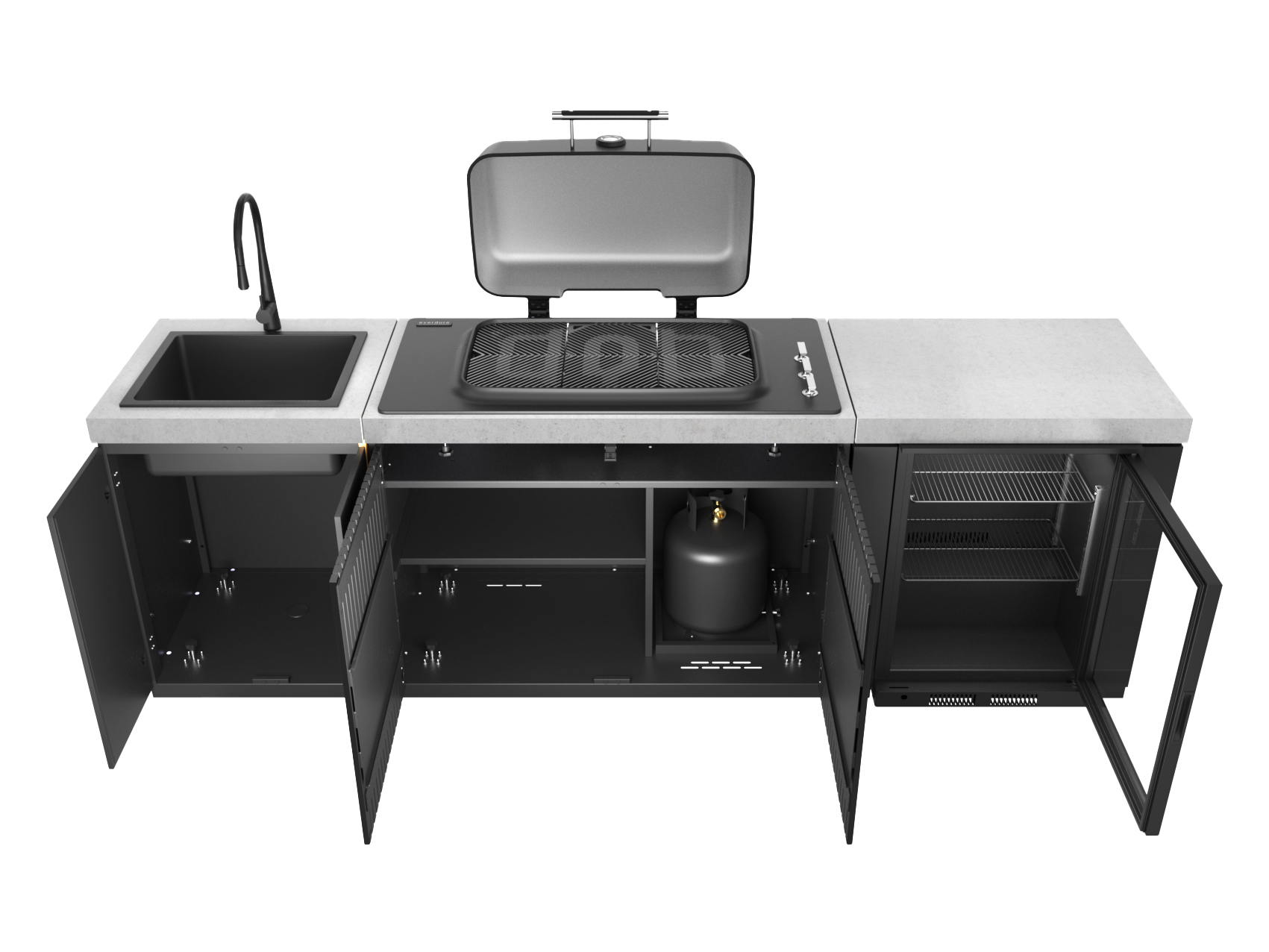 Das Getränkekühlmodul vereint Stil und Funktionalität und wertet Ihren Außenbereich auf. Es ist mit Aluminiumpaneelen in Marinequalität in mattschwarzem Finish ausgestattet und verfügt über eine Sinterstein-Arbeitsplatte, die das ästhetische Design perfekt ergänzt.