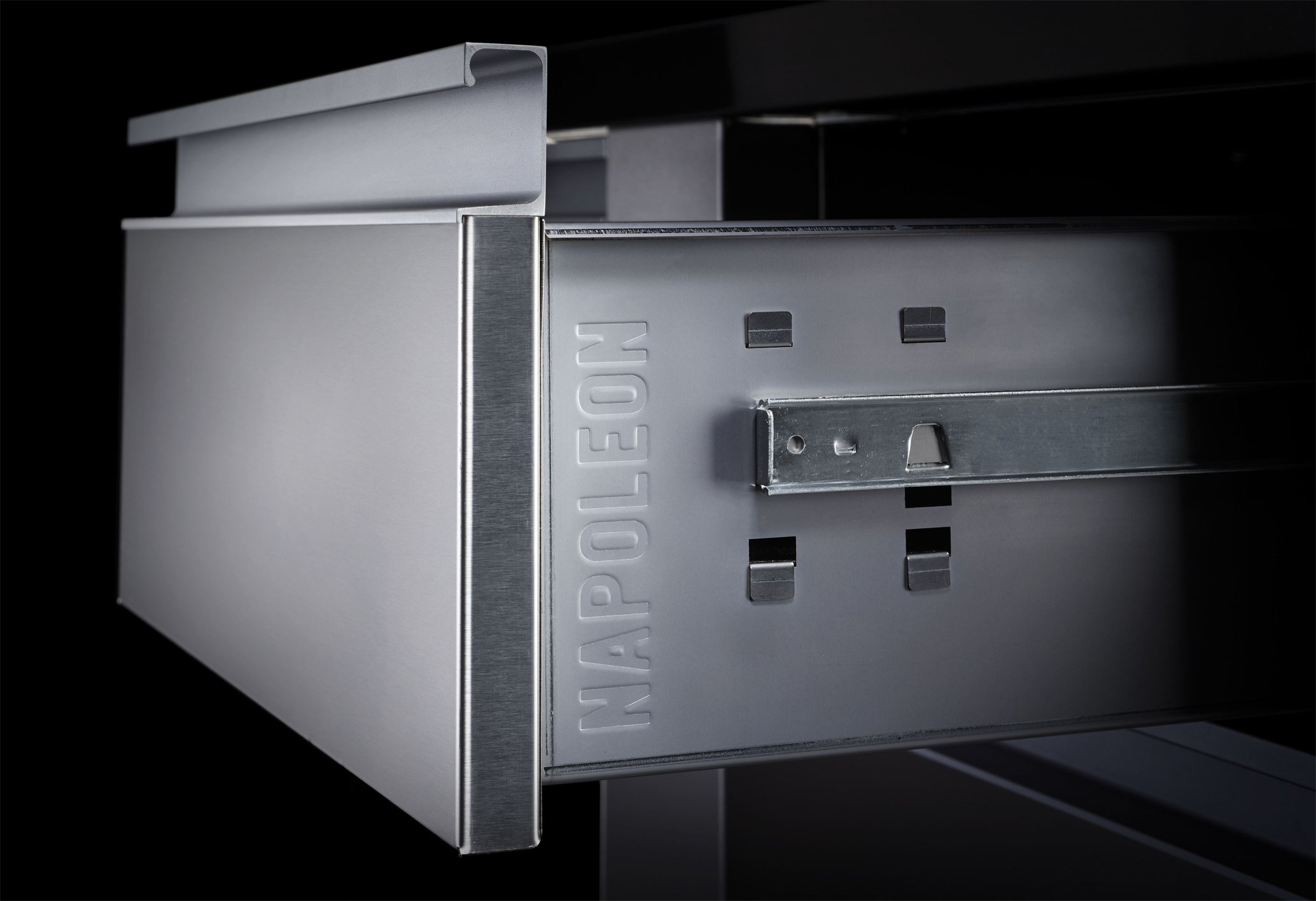 Ausreichend Stauraum für das wichtigste Grillzubehör. Beide Schubladen sind mit einer Softclose-Funktion ausgestattet und passen sich schick in die Napoleon® Outdoorküche ein.