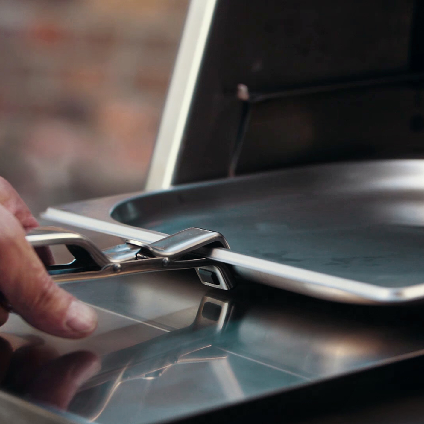 EINFACHES HANDLING: Mit Hilfe der Zange kannst du die Fettfangschale auch während des Grillprozesses aus dem Grill herausnehmen.