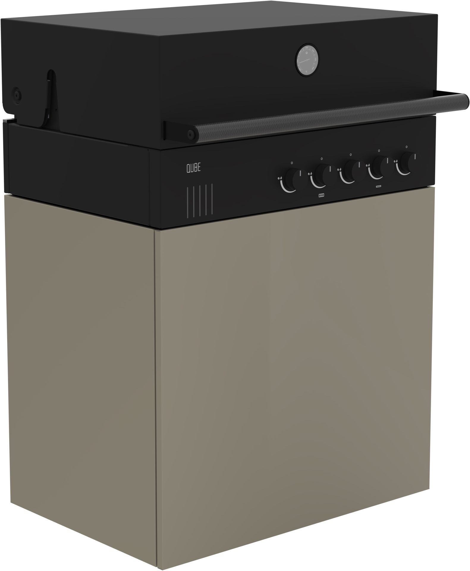 - Bestehend aus QUBE X-415 RB Einbaugrill und einem von 5 verschiedenen BBQ Unterschränken aus Edelstahl mit Pulverbeschichtung (RAL 9005 Black, RAL 3032 Red, RAL7043 Darkbrey, RAL 9001 Creme, RAL 7006 Taupe)