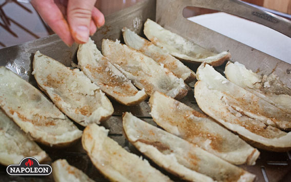 3. Alle Kartoffelschalen längs in Spalten schneiden, je nach Größe der Kartoffel ergibt ein 2-5 Stück. Beide Seiten der Kartoffelspalten mit Ihrem bevorzugtem Öl oder Butter bestreichen. Alles mit Memphis Rib Rub bestreuen.