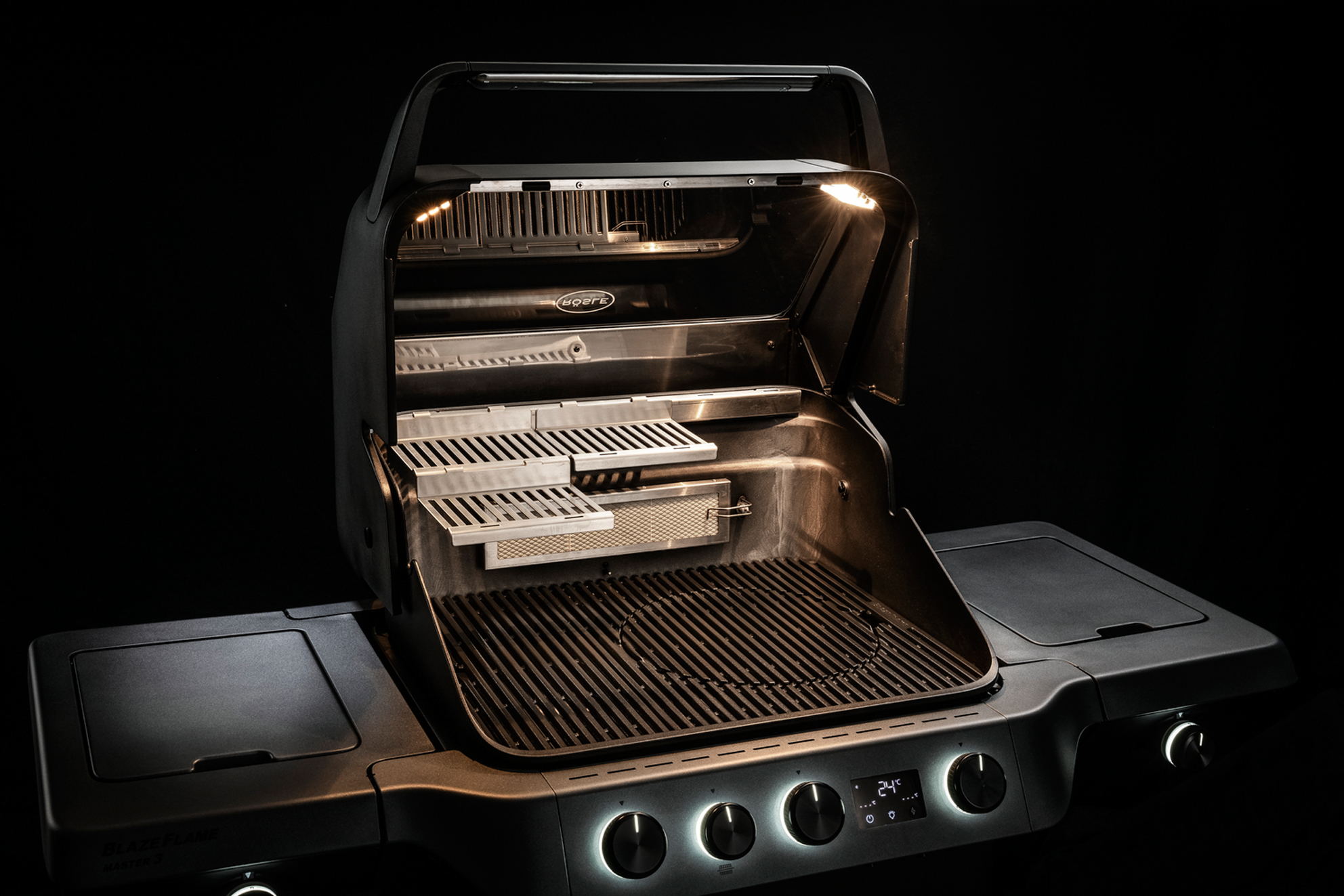 - Auch bei geöffnetem Deckel wird die Brennkammer optimal ausgeleuchtete, das Licht strahlt von oben auf die Grillroste