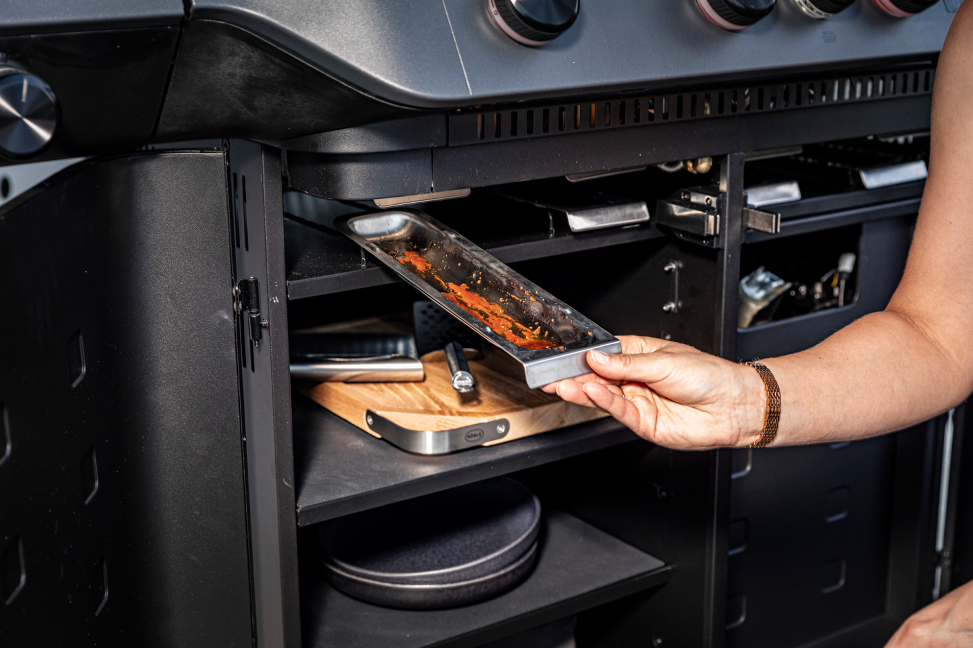 - Zusätzliche Arbeitsfläche zur Vorbereitung von Marinaden, Gewürzen oder als Ablage für Grillzange, inkl. Besteckhalter