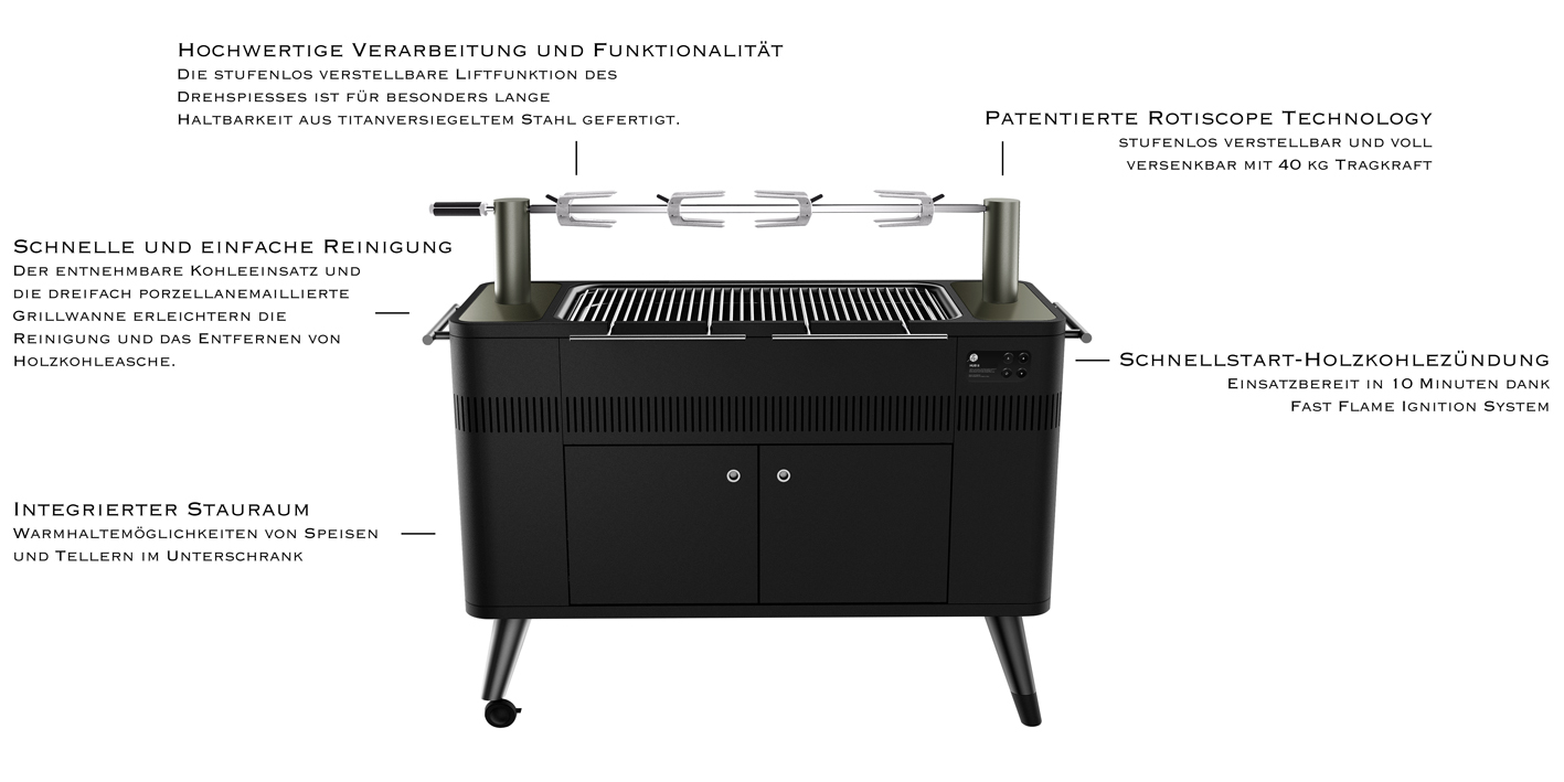 - Patentierte Rotiscope Technology mit stufenlos höhenverstellbaren Rotisserie-Säulen