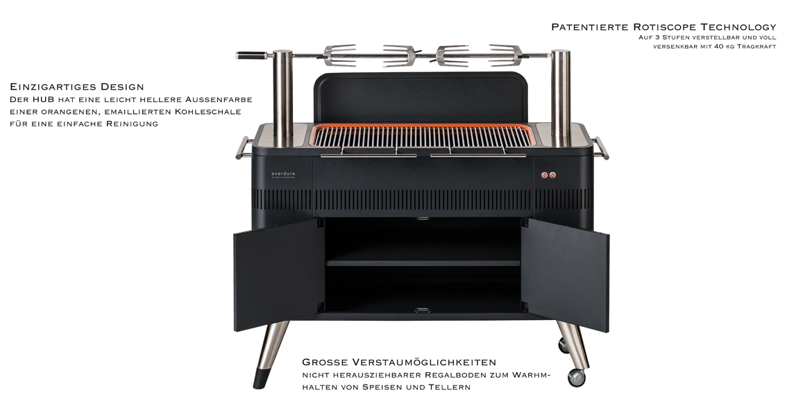 Ob Sie mit dem HUB nur ein paar einfache Nackensteaks befeuern wollen oder aber ein ganzes 3-Gänge Menü zaubern, bei der offenen Grillmethode werden stets alle Sinne Ihrer Gäste verwöhnt. So machen Sie jedes Gericht in Ihrem Garten zum Festmahl! Übrigens, das patentierte Rotisserie-System hat genug Tragkraft für ein ganzes Spanferkel. Der HUB ist einfach das perfekte Gerät für alle Outdoor Entertainer.