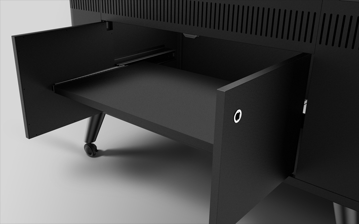 Mit einem ausziehbaren Regal auf Teleskopschienen, das sowohl als Stauraum als auch als Warmhaltefläche für Speisen und Teller genutzt werden kann.