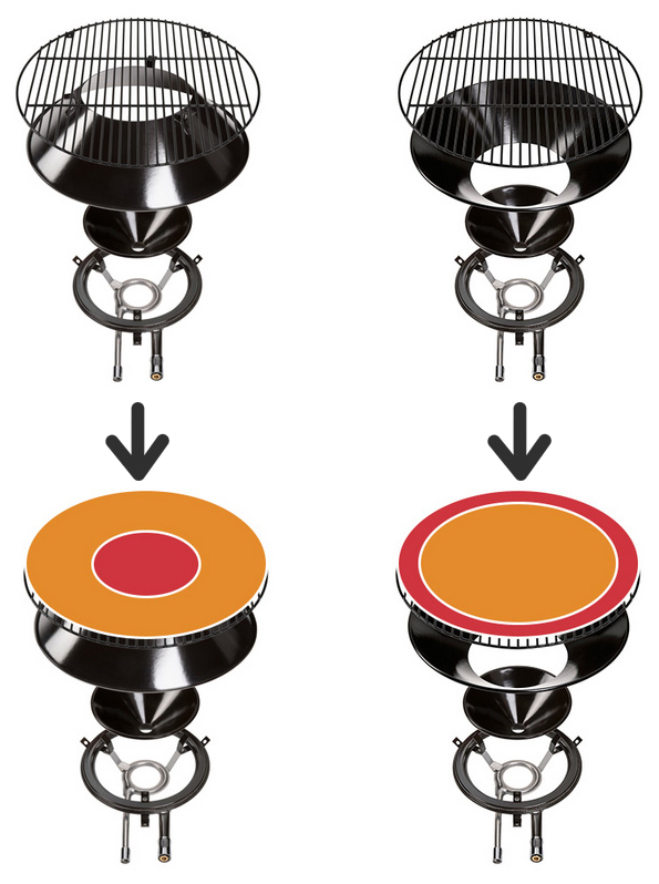 Darüber liegt der große Trichter. Dieser ist wendbar. Er kann durch die Drehung entweder für eine extrem gute indirekte Hitze sorgen (runder Brenner, runde Kugel, runder Trichter = nahezu perfekte Hitzezirkulation), oder auf kleinerer Fläche eine sehr Hohe und zentrierte Hitze zum Anbraten von Steaks, Kochen oder Woken.