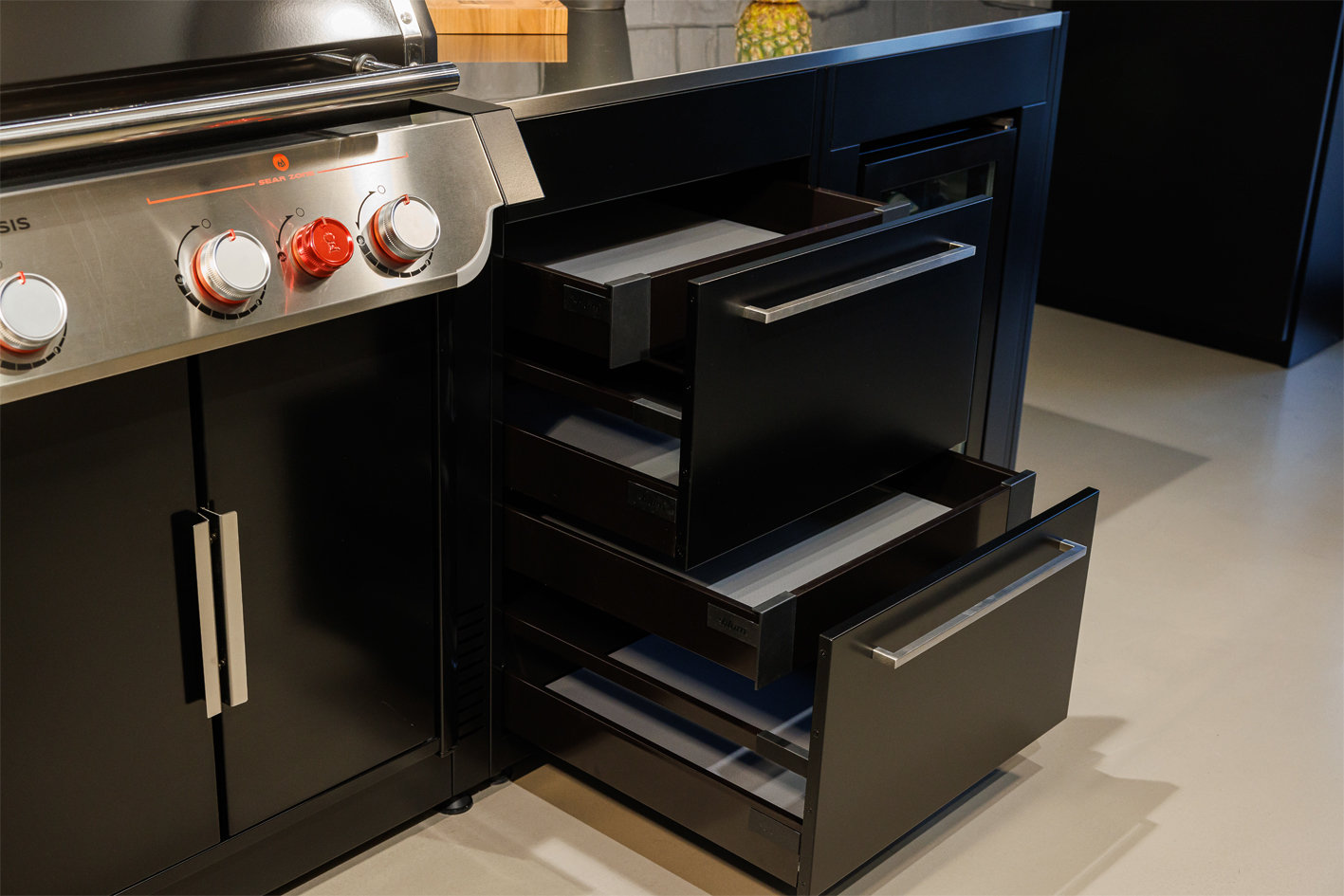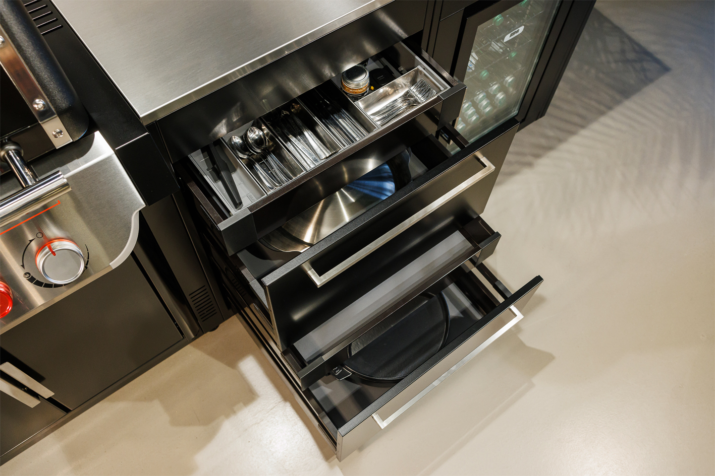 Mit einer maximalen Tragkraft von 65 kg pro Schublade ist das 2-fach-Ladenmodul ideal für die geordnete Aufbewahrung von schwerem Grillzubehör aus Gusseisen und anderen Grillutensilien. Auch kleinere Grillwerkzeuge für den Grillabend oder das Kochen können in der BBQ Kitchen aufbewahrt werden.